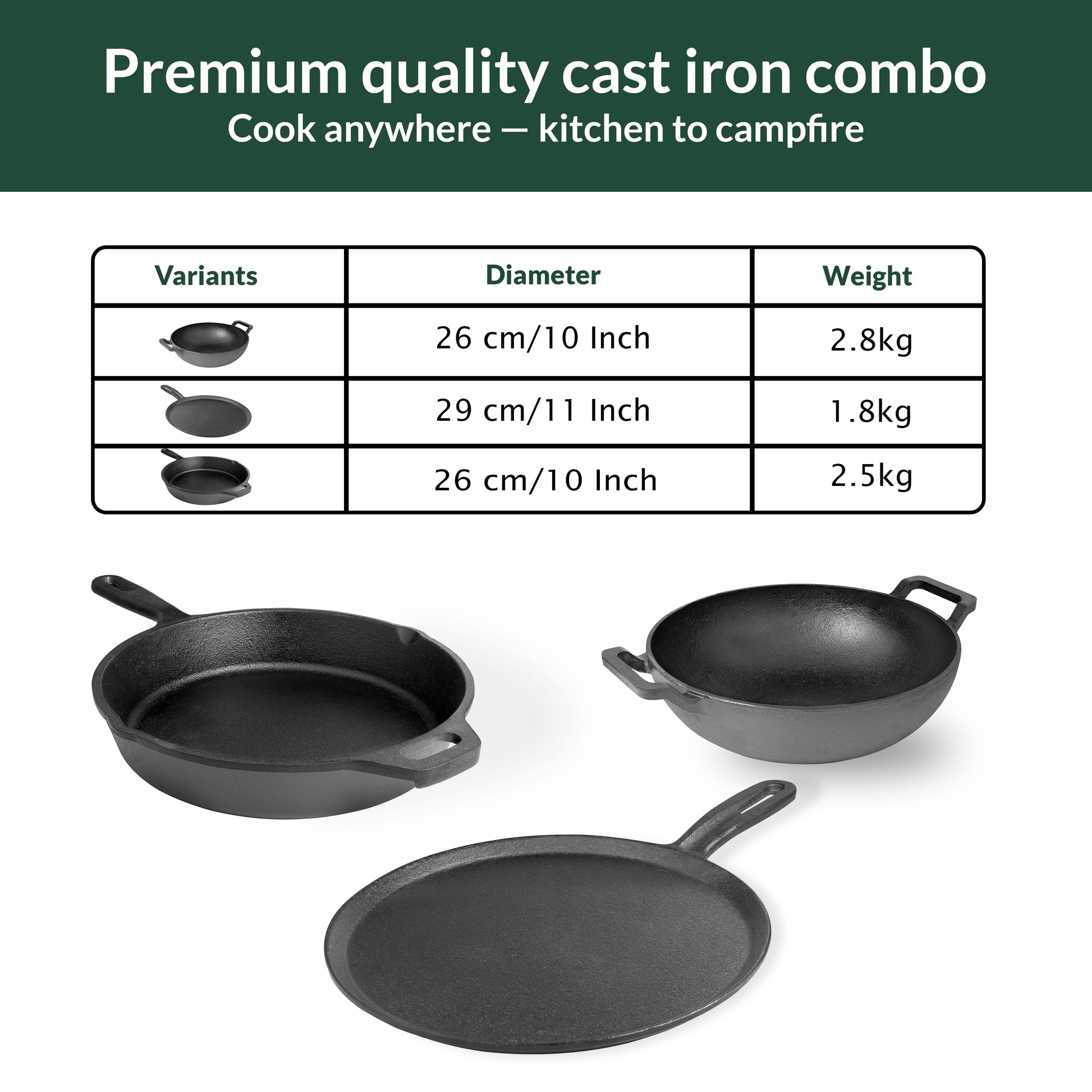- 🍳 Complete Cast Iron Combo – Includes Dosa Tawa (29 cm), Fry Pan (25 cm / 1.6 L), and Kadai (26 cm / 2.4 L) with 2 free wooden spatulas.