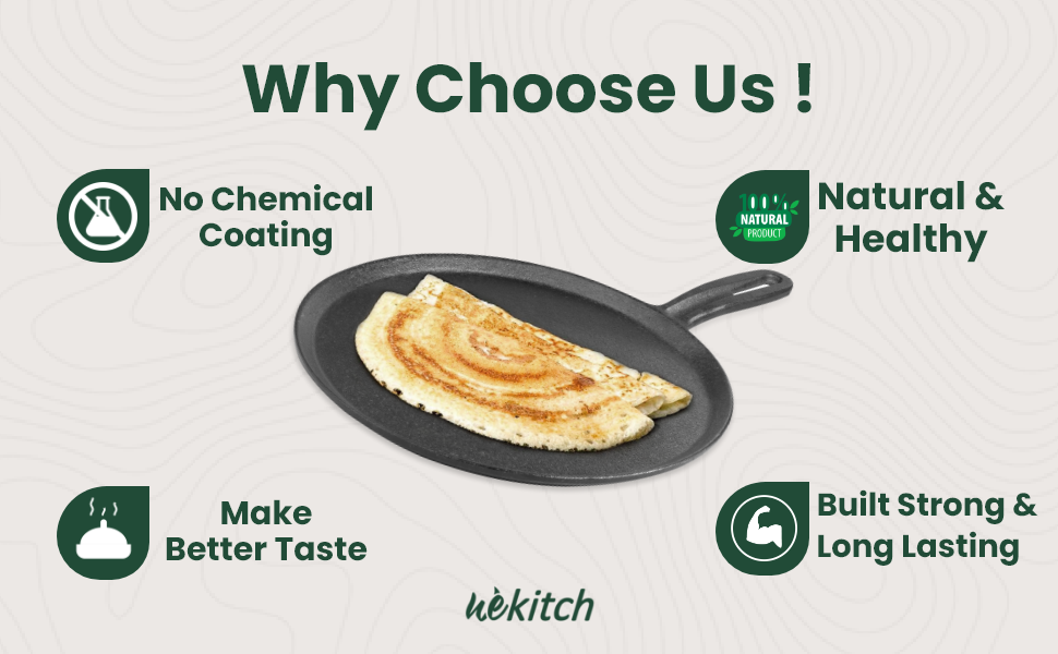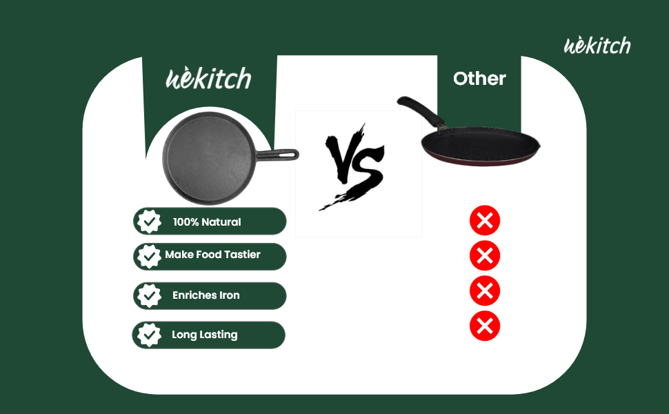 Unlike ordinary pans, this 100% natural cast iron dosa tawa enriches food with iron, enhances taste, and offers long-lasting durability, making it a healthier, tastier, and safer cooking choice.