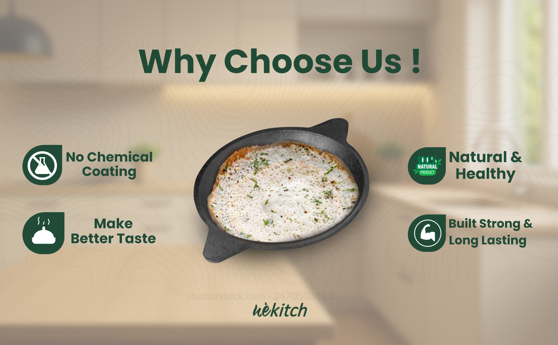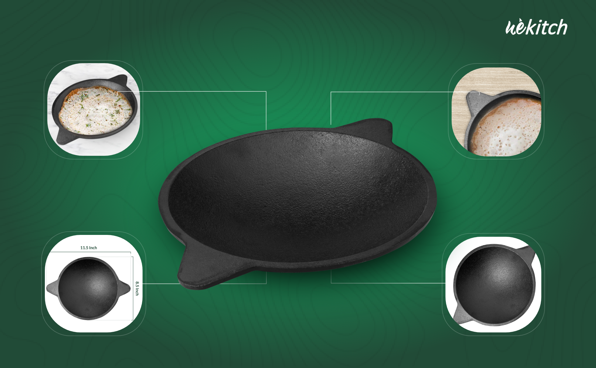 Unlike other non-stick or aluminium pans that wear out and release toxins, the Wekitch cast iron appachatti is 100% natural, durable, tastier, and naturally enriches every meal with iron.