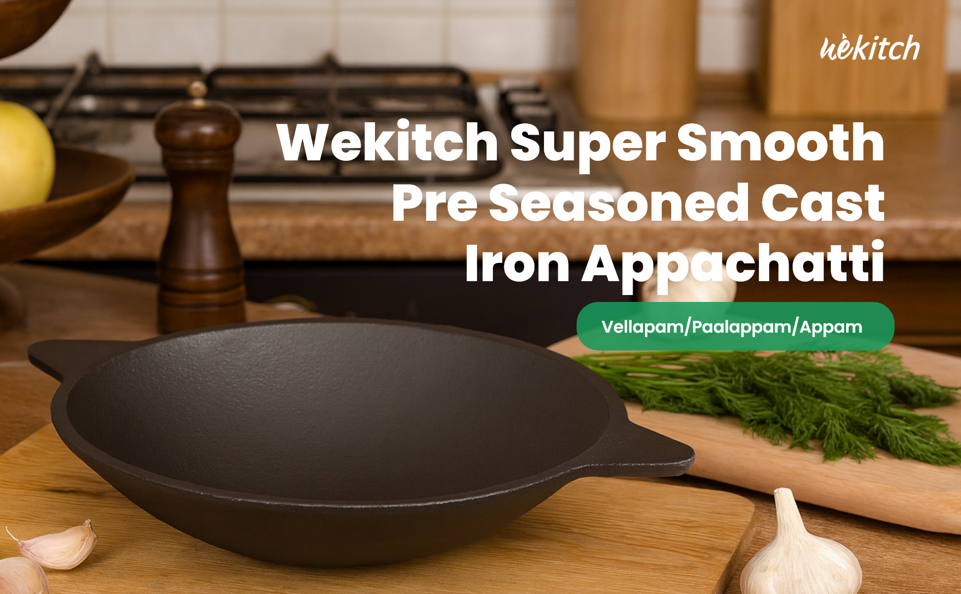 Wekitch pre-seasoned cast iron appachatti is crafted for vellappam, paalappam, and appam. Naturally nonstick, toxin-free, durable, and built for authentic, flavorful cooking with perfect texture every time.