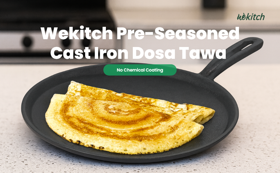 Experience authentic Indian cooking with the Wekitch Pre-Seasoned Cast Iron Dosa Tawa. Crafted from heavy-duty cast iron, this tawa is perfect for making crispy dosas, fluffy rotis, soft chapatis, and delicious parathas. Its naturally nonstick surface improves with every use, ensuring healthy, chemical-free cooking. Compatible with gas and induction stoves, it offers superior heat retention and even heat distribution for perfect results every time.