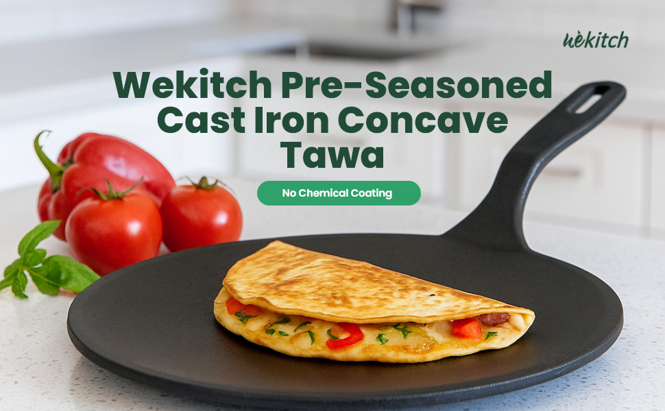 Experience authentic Indian cooking with the Wekitch Pre-Seasoned Cast Iron Concave Tawa, ideal for making crisp dosas, soft rotis, chapatis, and more. Crafted from durable cast iron cookware, it ensures even heat distribution and excellent heat retention. The naturally nonstick surface improves with every use. Compatible with induction and gas stoves, this tawa is a must-have for every kitchen.